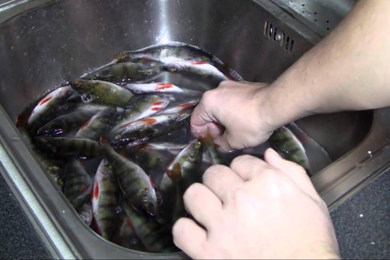 Промыть окуней под проточной прохладной водой и выпотрошить. Для этого выкладываем рыбу на разделочную доску и ножом делаем надрез по брюшку от заднего нижнего плавника и до головы. После этого чистыми руками достаем все внутренности и промываем окуня со всех сторон под проточной водой