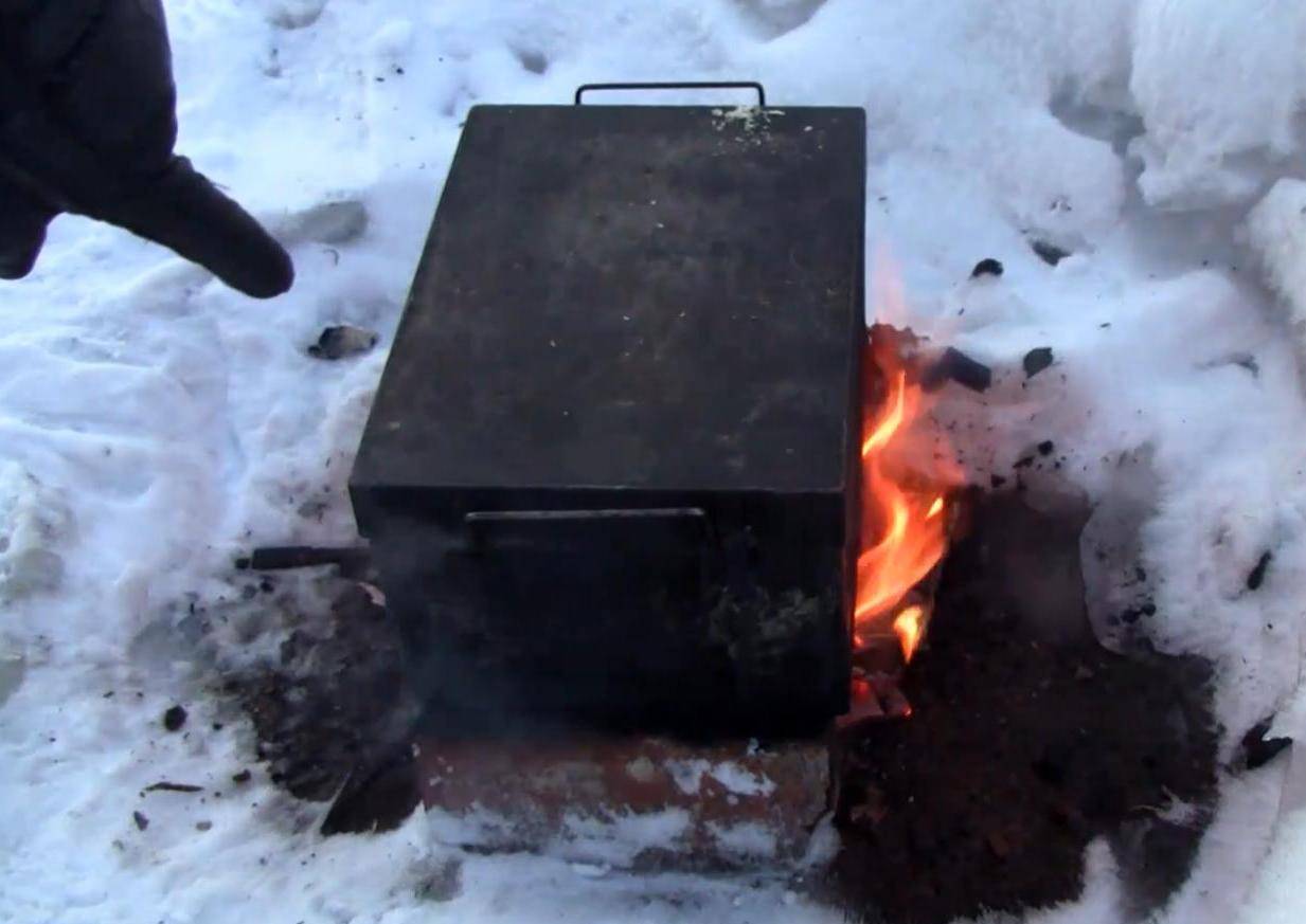 - Формируют костер, на дно агрегата укладывают щепку. Разводят огонь, тушки укладывают на решетки.