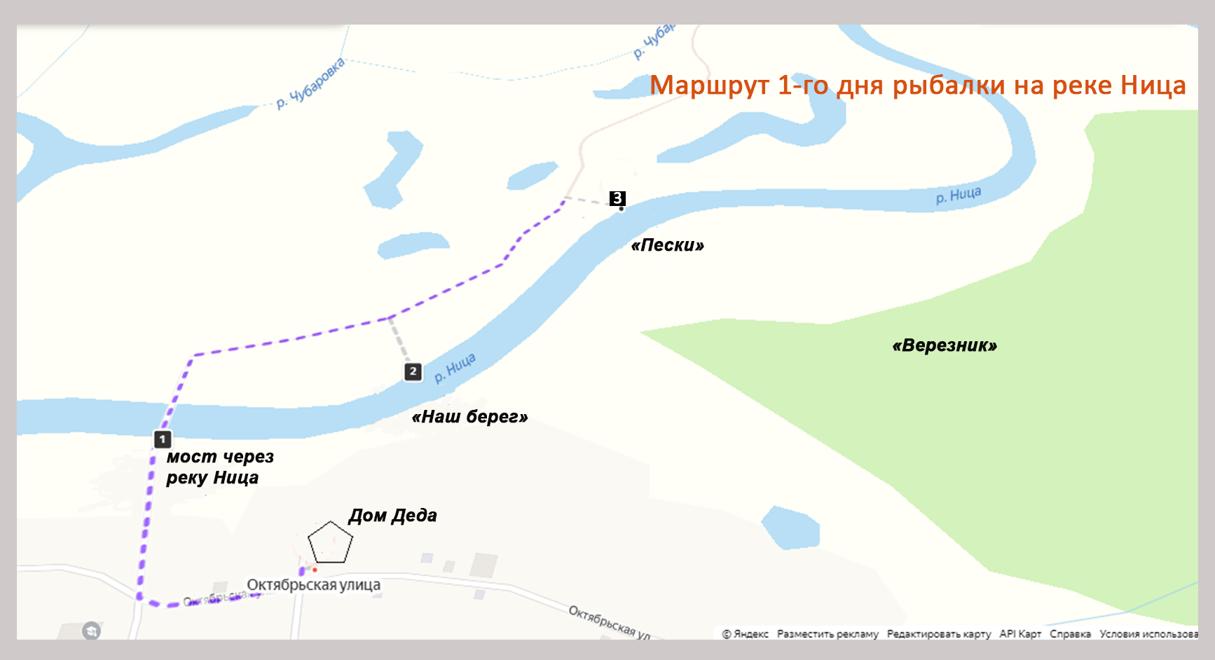 Далее предложил попробовать порыбачить напротив “нашего” берега, поэтому мы все двинулись направо от моста вниз по течению реки, где примерно в 30-50 метрах от моста Кит поймал свою первую рыбу на реке Ница – окуня на 200 грамм