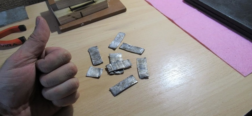 Редко используется рыбаками, т. к. подобрать нужный вес сложно. Нужно протестировать огрузку поплавка в воде. Листы свинца – недорогое и простое в исполнении грузило. Его можно сделать в домашних условиях, расплющив кусок металла и разрезав на нужные кусочки обычными канцелярскими ножницами.