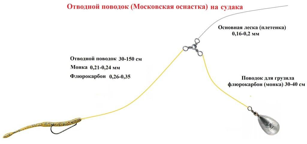 Основным поводком служит флюорокарбоновая леска диаметром 0,28–0,33 мм. Она хорошо переносит абразивные нагрузки, часто возникающие при ловле в придонном слое. Не стоит использовать более толстые мононити, так как они будут ломать игру приманки и настораживать судака.