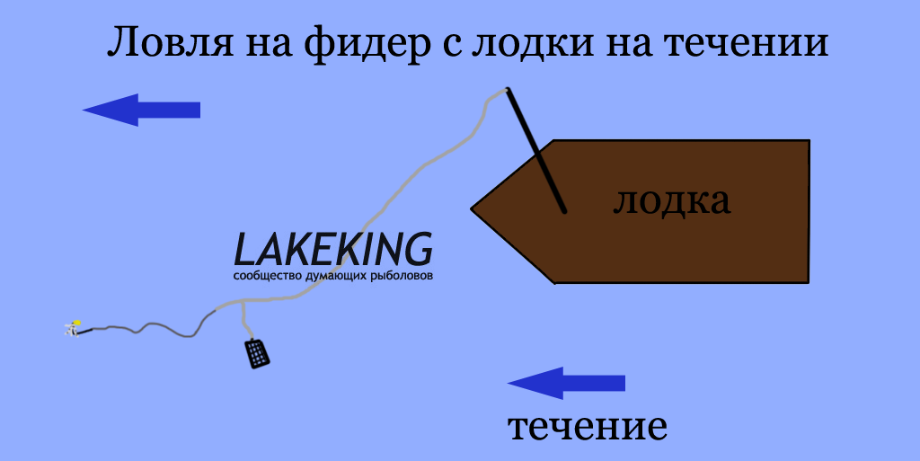 При ловле на сильном течении важно учитывать направление течения. Схема: