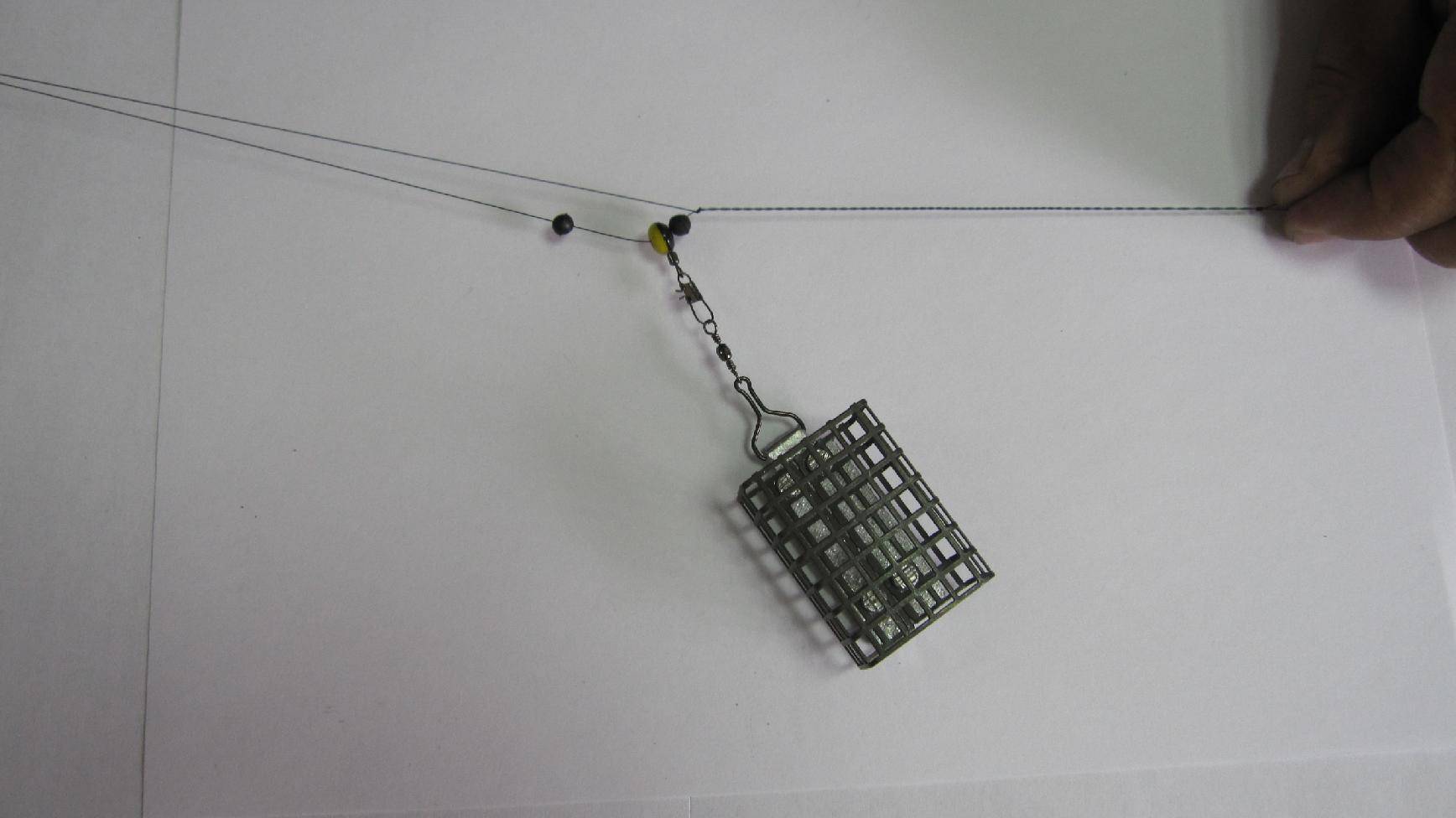 на конце основной лески вяжется маленькая (2–3 см) петелька для поводка и тройной узел, перед затягиванием важно каждый узел смачивать; на расстоянии 10–16 см от первой связывать следует вторую петельку, через неё должна проходить кормушка; верхняя петелька продевается через вертлюжок, затягивается и обводится вокруг кормушки; и методом петля в петлю. В нижней петельке закрепляется поводок.