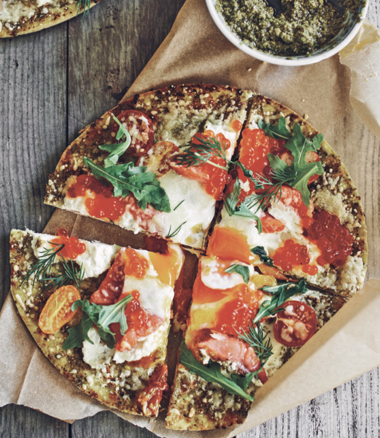 - Тесто смажьте песто. Риккоту и помидоры распределите по краю пиццы. Добавьте лосось ближе к центру. Разбейте яйцо в середину каждой пиццы, сверху посыпьте сыром и молотым чёрным перцем.