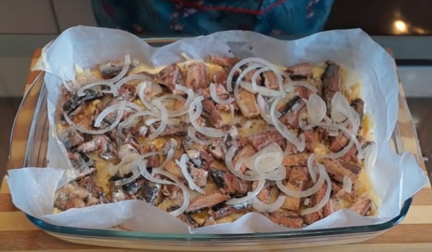 - Затем выкладываем начинку и аккуратно раскладываем по всему картофелю.