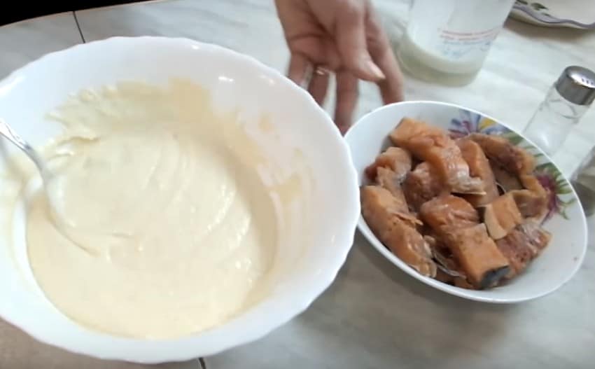 Добавить теплый кефир и муку, разрыхлитель или соду, всыпать муку и замешивать венчиком тесто, пока не растворятся все комочки. Открыть консервы, слить жидкость, если у кусочков внутри есть хребтовые косточки, то рекомендуется их вынуть, а консервы размять вилкой. Отварить куриные яйца до готовности, остудить и почистить, нарезать довольно мелкими кубиками и смешать с рыбой.