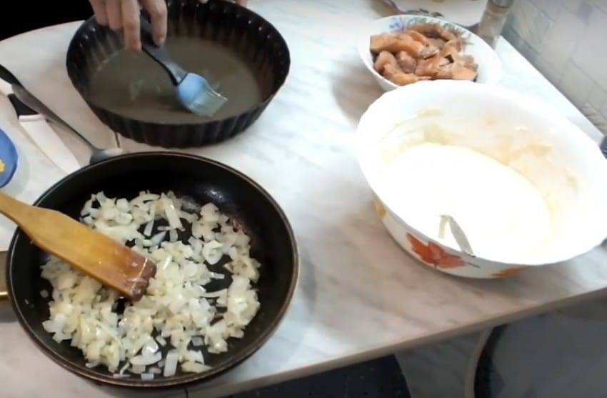 5. Форму смажьте маслом, вылейте половину теста тонким слоем. По его поверхности распределите половину лука, распределите кусочки рыбы и посыпьте остальным луком.