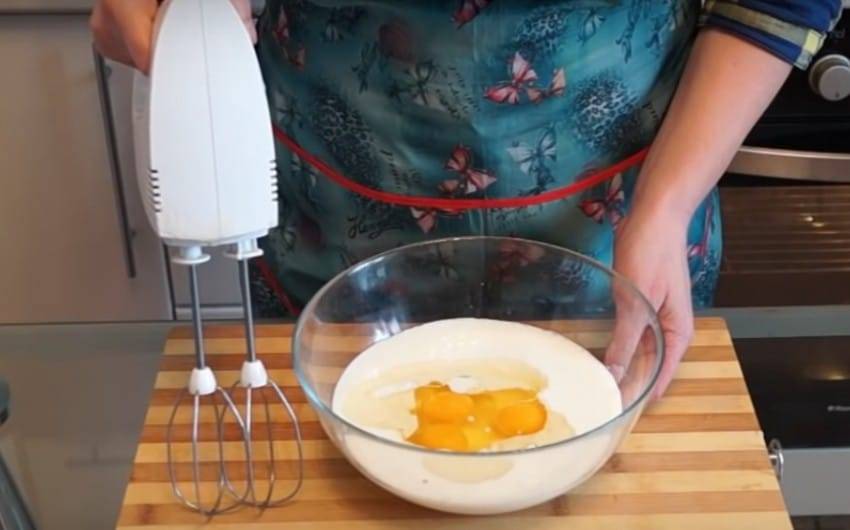 - С помощью венчика (или миксера) смешиваются все ингредиенты. Закваска убирается в сторонку на 5 минут.