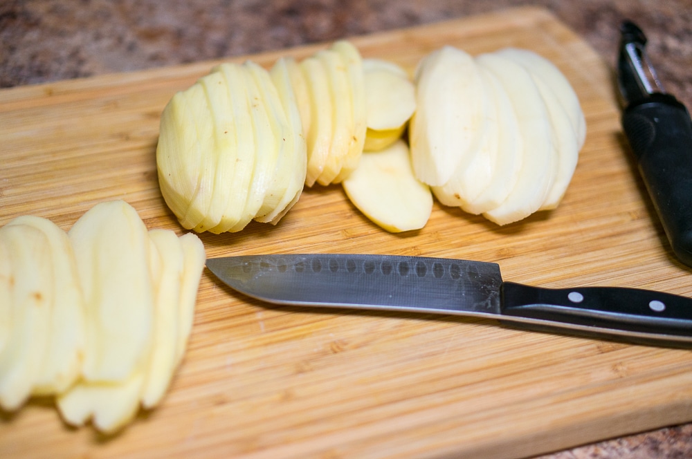 - Вымыть и вычистить картофель, нарезать тонкими ломтиками.