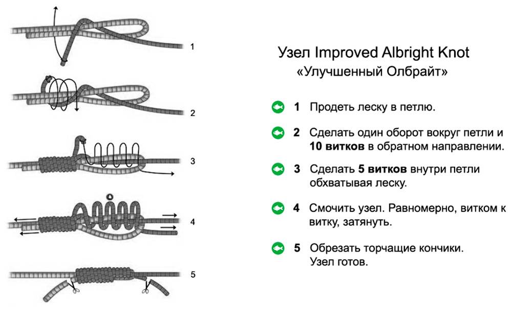 Также он подходит для связывания плетеного шок-лидера и лески. Для скрепления моношока и монолески лучше использовать Двойной Гринер.