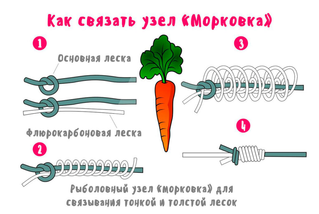 Связать две лески в морковку сложно, но при должной практике и усидчивости “приноровиться” можно.