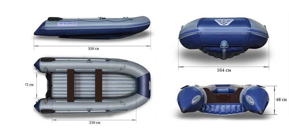 Габаритные длина и ширина лодки соответственно 3, 5 и 1, 64 метра, а площадь кокпита 0, 72х2, 5. При таких размерах масса судна всего 36 кг, а перемещать лодка способна до 480 кг груза. Без учета НДНД конструкционно предусмотрено 3 отсека и 3 клапана для спуска воздуха. Соединение швов клеевое.