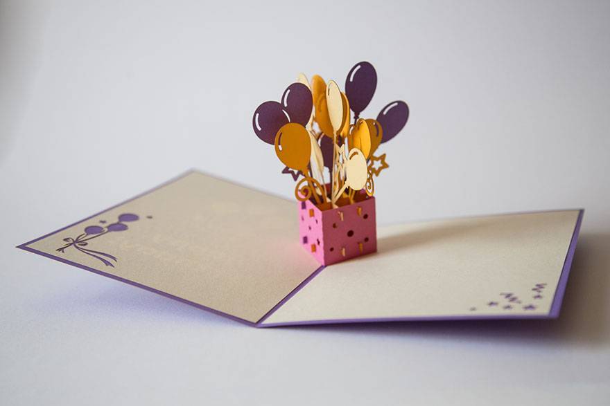 Помимо цветов из открытки могут выглядывать воздушные шарики, звездочки, бантики.