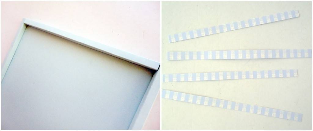 Сначала делаем рамку-коробочку. Для этого берем плотную голубую бумагу и вырезаем из нее шаблон для коробочки. Края шаблона складываем 4 раза по 5 мм с каждой стороны, формируя тем самым рамку. Склеиваем получившиеся рамочки.