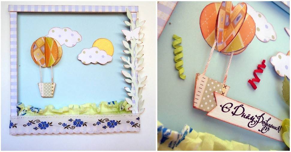 Вырезаем облака из скрап-бумаги, а из желтой бумаги солнышко. Вклеиваем элементы композиции в рамочку. Воздушный шар приклеиваем следующим образом: основание шара клеим на объемный скотч, а сам шар на клей. Облака клеим по тому же принципу: одно на клей, второе на объемный скотч.