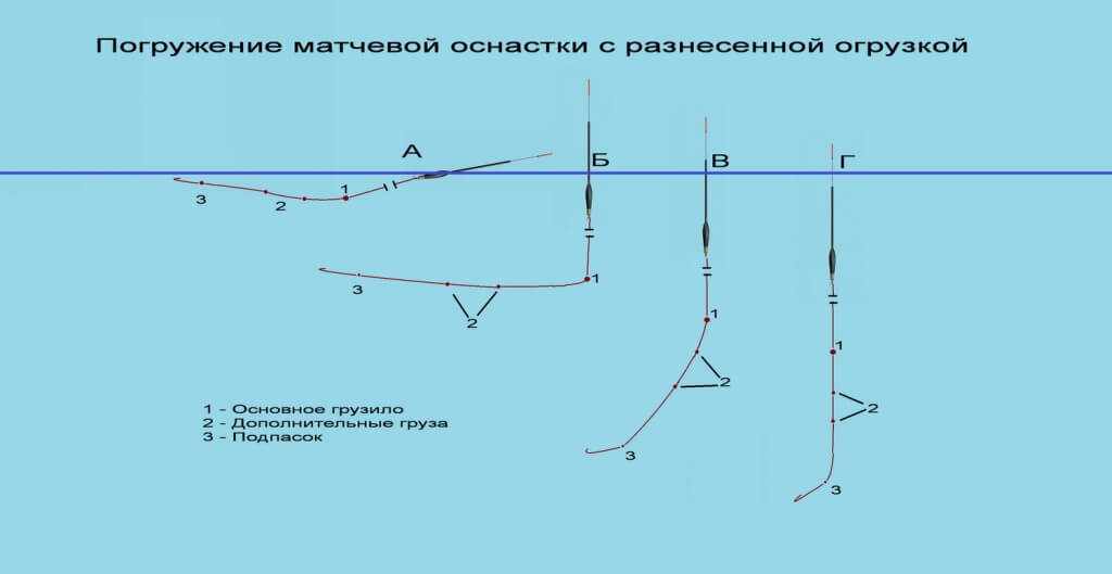 - На основной леске вплотную к поплавку устанавливаются 2-3 крупные дробинки. Общий вес этих утяжелений с телом поплавка должен составлять 80-85% массы грузил.