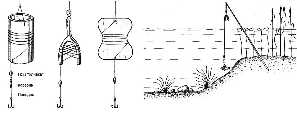 Существуют конструкции, которые состоят из тяжелого груза и поплавка, что позволяет устанавливать их с лодки. Это дает возможность обловить более глубокие места. Ведь с берега особо далеко трудно забросить снасть.