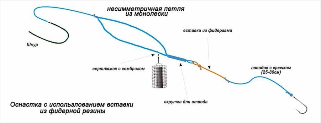 - Самоподсекающая снасть асимметричная петля. Эта снасть очень часто применяется любителями фидерной ловли на сильном течении, так как за счет отсутствия симметрии поводок практически не перекручивается. Применяется гораздо чаще, чем вышеописанная снасть и является её усовершенствованной моделью.