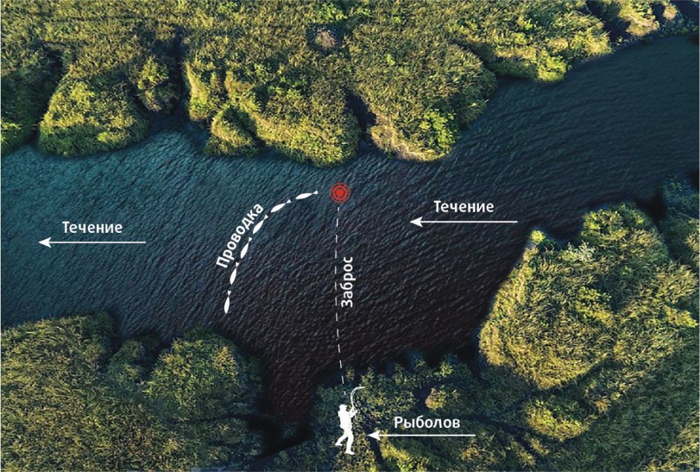 В этот момент подмотка катушкой не осуществляется, при этом важно держать шнур в натяжении. «Игра» приманки реализуется с помощью течения, а горизонт проводки меняется положением вершинки удилища