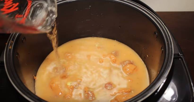 - Тем временем наливаем в стакан (примерно на половину) воду и, разведя в ней муку, выливаем в сковороду. Затем доливаем еще стакан воды и перемешиваем.