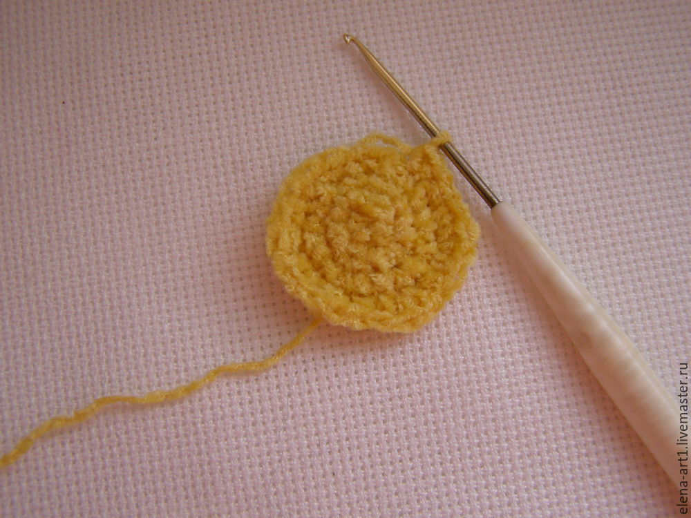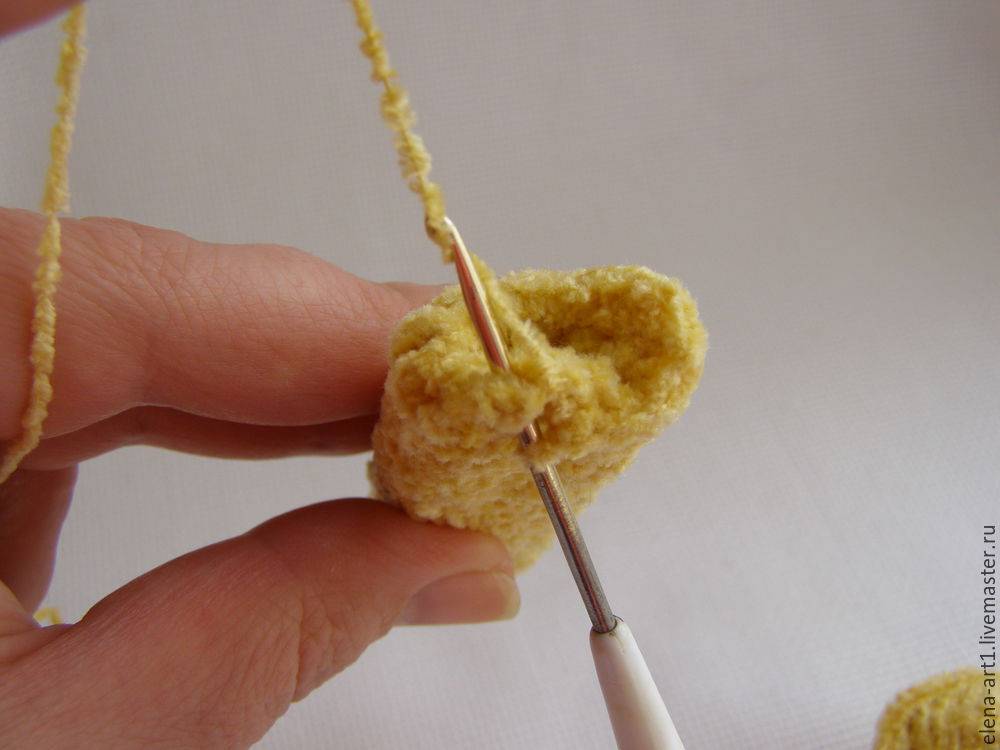 Во второй ряд делаем произвольно 2 прибавки, но все зависит от ваших ниток, может понадобится больше, а может, и меньше прибавок, меряйте, нам нужно связать основание для лапки.