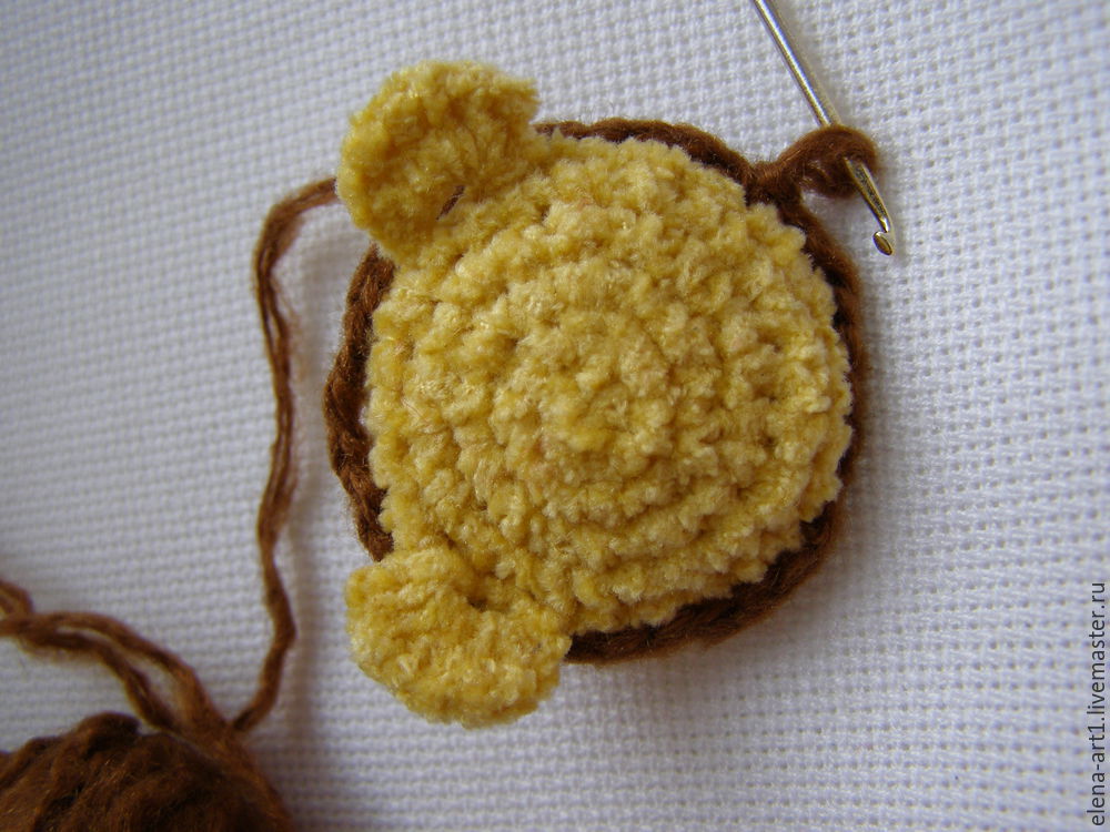 Делаем обвязку этого же ряда, в котором работали с ушками. Присоединяем коричневую нить и делаем арочки по ряду из 3 воздушных петль каждая.