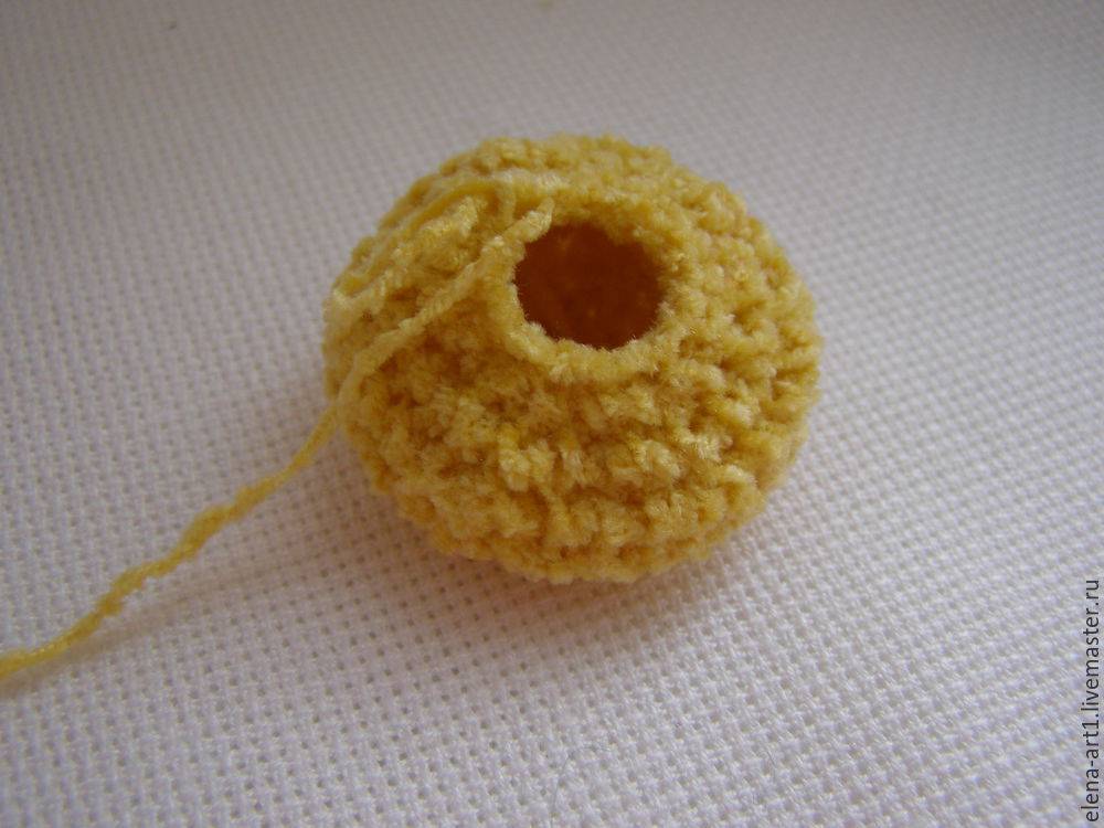 В верхнюю часть прищепки присоединяем нить (чтобы хвост был плотнее, вяжите в две нити), делаем 7 воздушных петель, теперь возвращаемся назад, провязывая по этим петелькам соединительные столбики. Нить фиксируем и обрезаем.