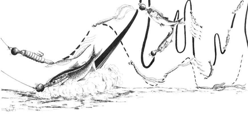 Все виды движений сводятся к ряду вариантов джиговой проводки, причем приманка все время контролируется рыболовом.