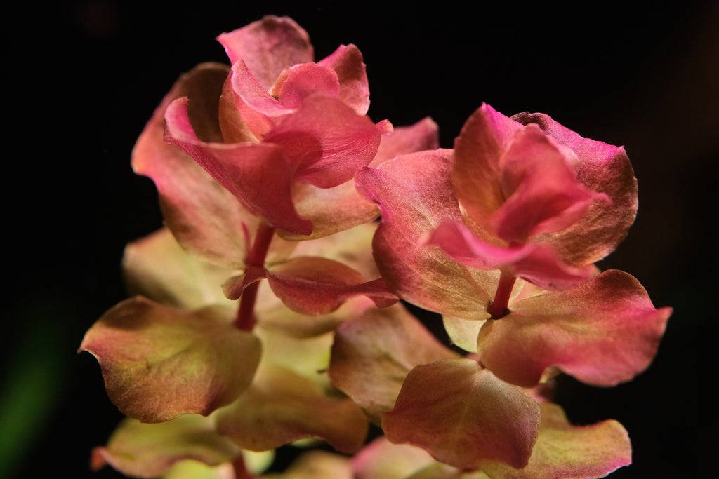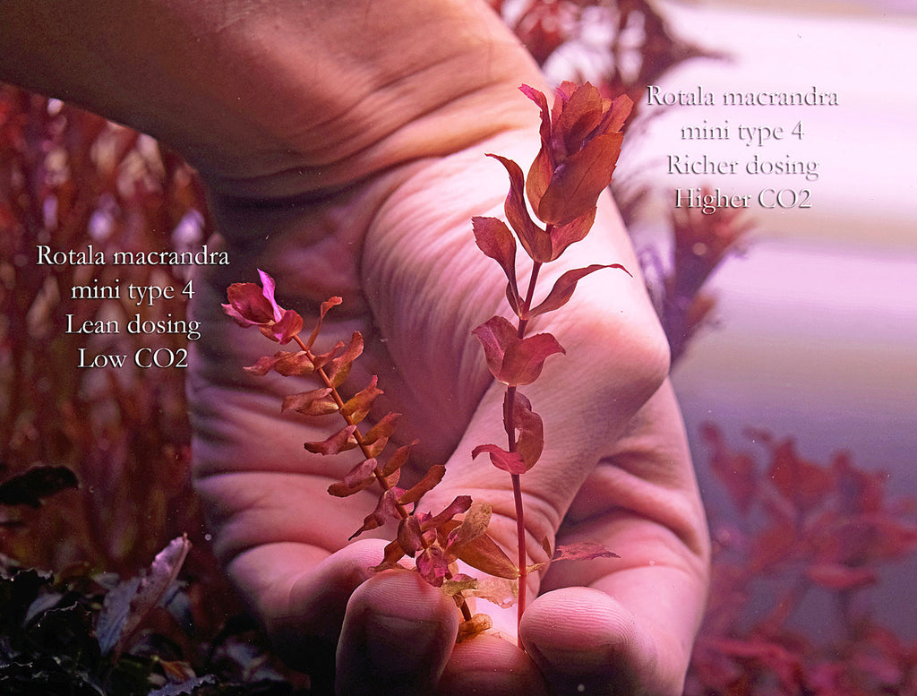 Rotala macrandra does best with CO2 injection. Rotala macrandras generally do not actually require very high levels of CO2, however, they do not take CO2 fluctuations well. So CO2 levels have to be sustained at a steady level (long term) whether you choose a higher or lower injection rate. Dips or inconsistent CO2 levels easily lead to stunting of tips in the more picky varietals. Lower injection rates can give more compact and smaller growth forms, along with slower growth. There will also be less branching at low CO2 levels. Higher injection rates give larger, more robust plants – this will be more favourable to newly introduced, adapting or damaged plants. At higher CO2 levels, there will be more branching off the main stem, and significantly faster growth speed. Growing them at high speed also means that there is less room for error in fertilization – if fertilization is overly lean when light and CO2 levels are high, there will be premature deterioration of lower leaves.