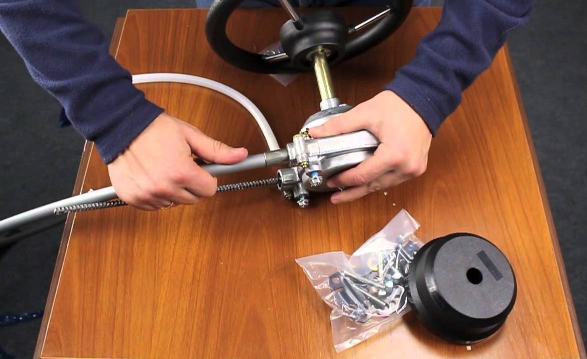 Дистанционное управление для лодочного мотора состоит из нескольких различных приспособлений: рулевого колеса, редуктора, рулевого троса и рулевой тяги. Эти элементы, с помощью закрепления между с собой, образуют систему управления.