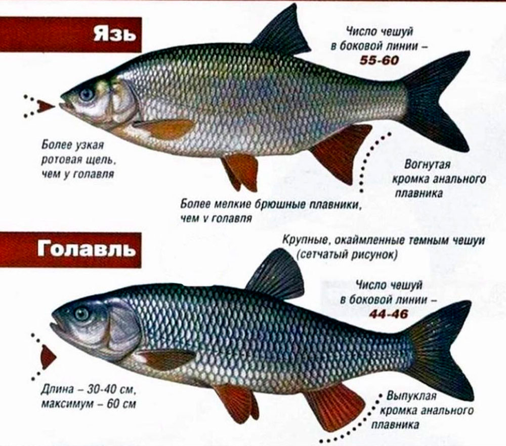 | Части тела, имеющие отличия | Язь | Голавль | Жерех |