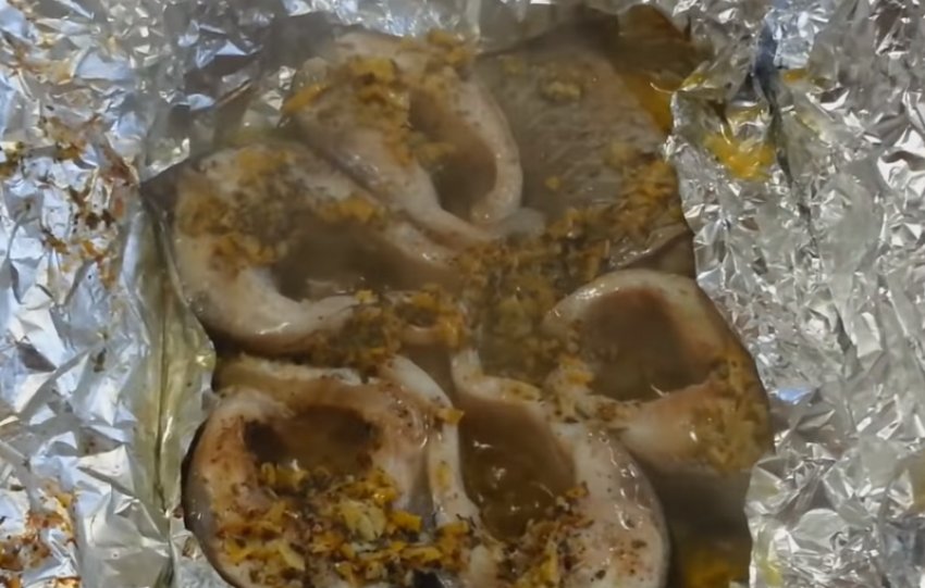 - Начиненную рыбу нужно выложить на фольгу иплотно завернуть, желательно в несколько слоев.