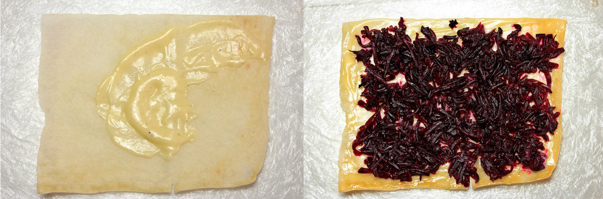 Подкладываем под первый лист лаваша полиэтилен или пищевую пленку и смазываем лаваш тонким слоем майонеза и сверху вареную натертую на крупной терке свеклу. Чуть-чуть прижмите ладошкой.