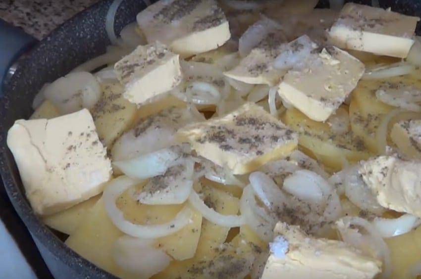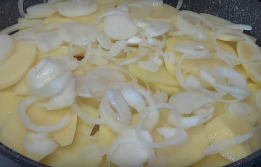 5. Последним слоем будет лук, равномерно разложите его по картошке.