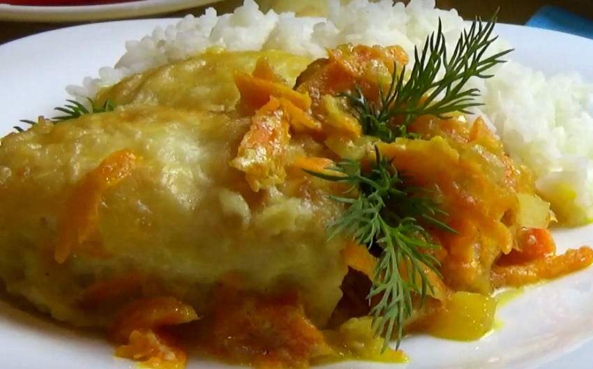 Такой вариант приготовления мой самый любимый, так как он не требует много времени и усилий. Всего 40 минут и на вашей кухне будет стоять сливочный аромат сочного блюда с гарниром. В данном рецепте используется минтай, но можно взять любую другую рыбу. В любом случае будет очень вкусно! Подавайте с салатом из капусты или малосольными огурцами.