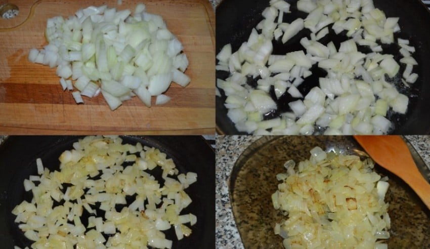 3. Лук нашинкуйте небольшими кубиками, обжарьте на сливочном масле до мягкости. Переложите в тарелку.