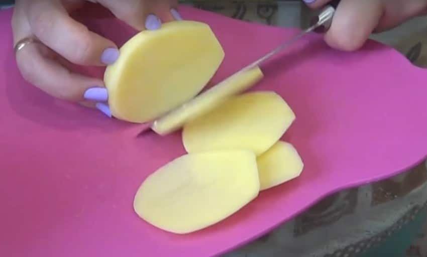 2. Очищенный картофель порежьте на тонкие пластины. Лук нашинкуйте полукольцами.