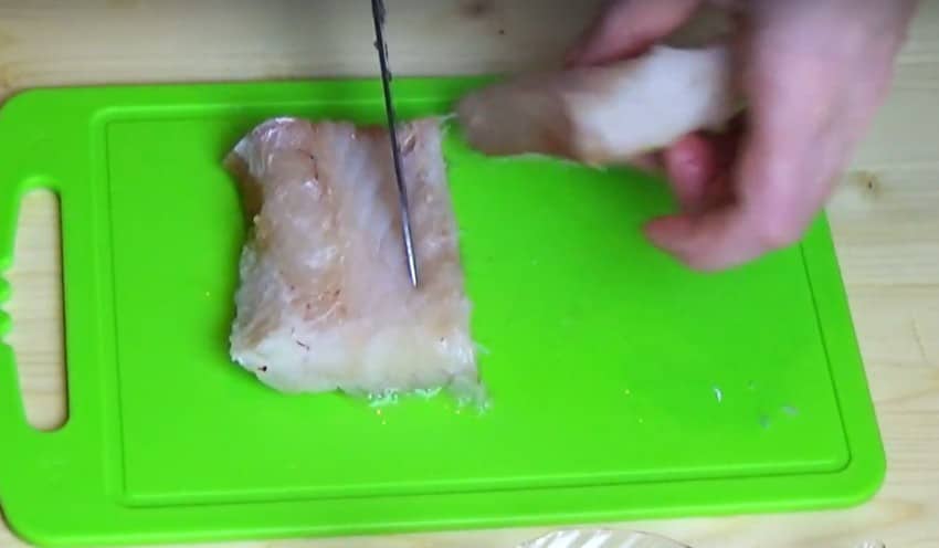 - Со второй филейной части удалите хребет руками. Позже из него мы будем варить бульон, так что не выбрасывайте его. Ножом подрежьте и удалите кожицу с обеих филейных частей.