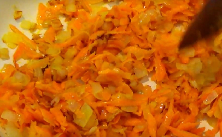 Нагрейте в сковородке масло, обжарьте лук и морковку до мягкости.