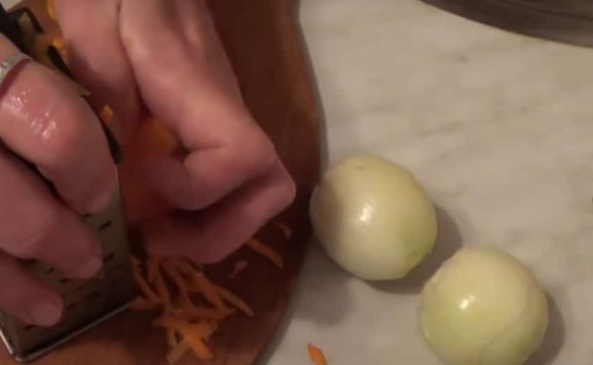 - Одну морковку помойте и натрите на крупной терке. Луковицу очистите, мелко нарежьте.