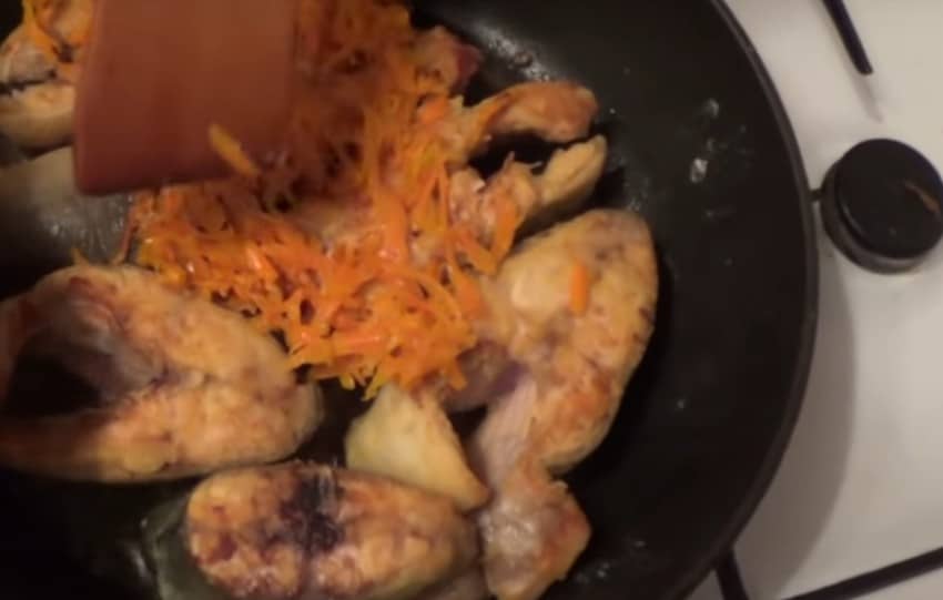 4. На другой сковороде поджарьте лук и морковь. Аккуратно уложите овощи сверху полуготовой горбуши.