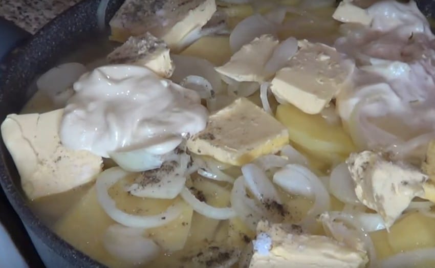 7. Добавьте майонез или сметану — тут кому как больше нравится. Налейте в сковороду воду так, чтобы она покрывала картофель, и накройте крышкой до закипания.