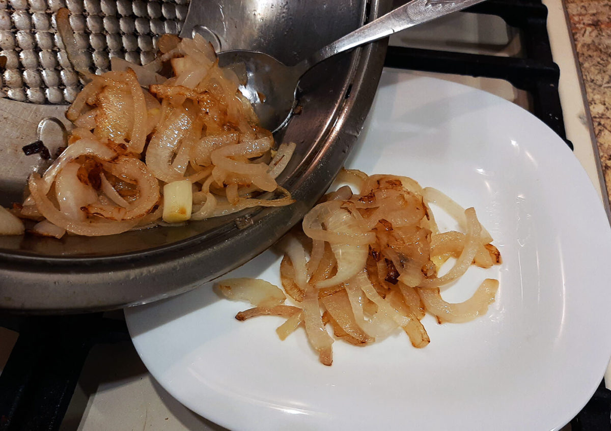 - луковицы очистить, нарезать полукольцами и обжарить до золотистого оттенка;