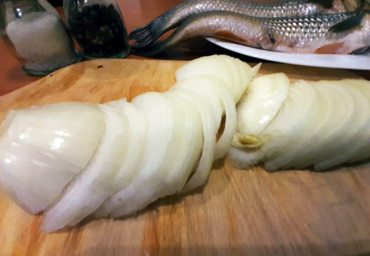 Репчатый лук чистят, режут на полукольца. Если необходимо приготовить блюдо большого объема, которого хватит на несколько человек, то количество продуктов пропорционально увеличивают. При этом рекомендуется соблюдать пропорцию лука и рыбы. Она составляет примерно 1:2.