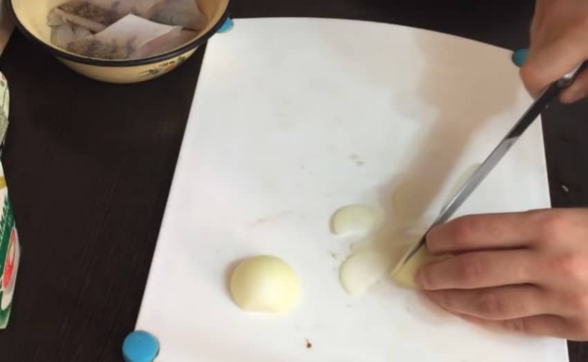 Треску нарезаем на порционные кусочки, при этом не забываем, что маленькие куски удобнее переворачивать на сковороде с маслом. Рыбу солить нет надобности, соль уже присутствует в достаточном количестве в тесте.