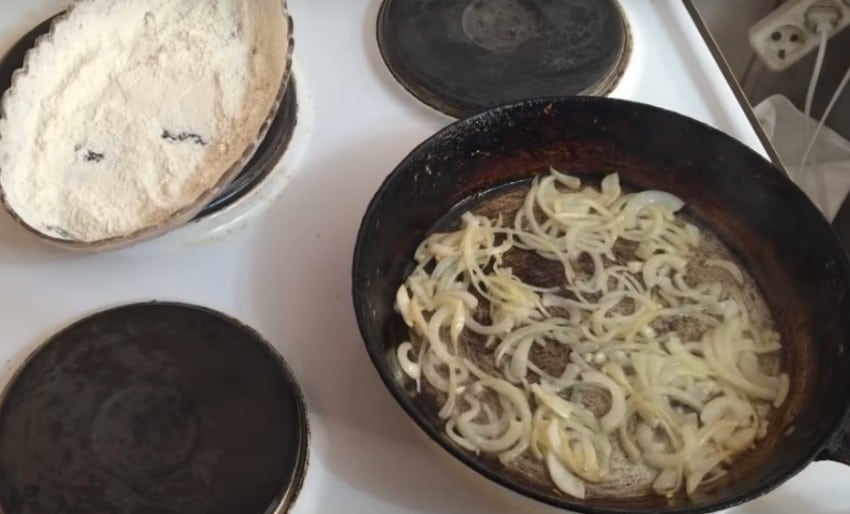 - Нарезаем лук полукольцами, пассируем на раскаленном масле;