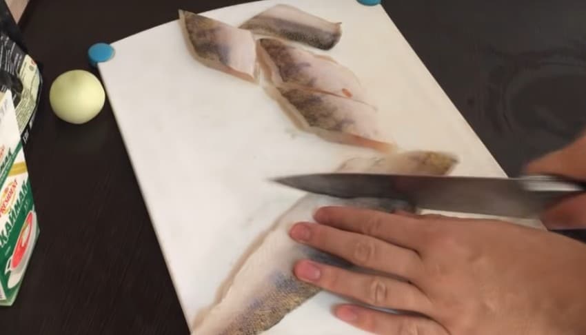Пройти пальцами вдоль поверхности филе, и убедиться, что нет мелких костей, после чего порезать филе на кусочки среднего размера, посолить, поперчить.