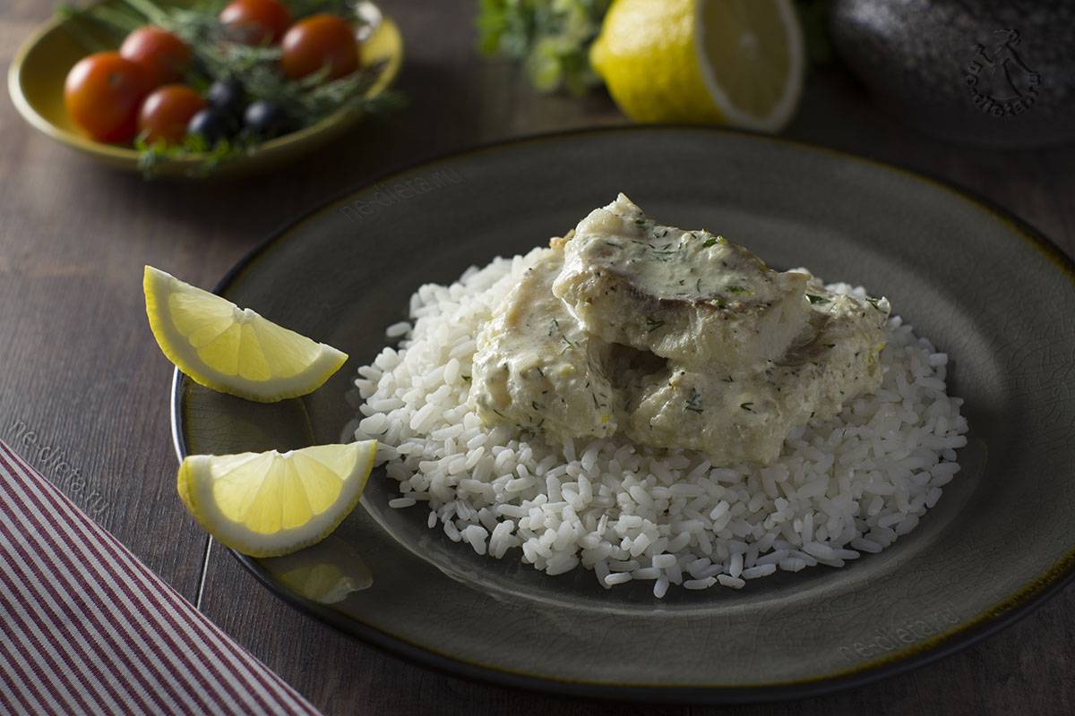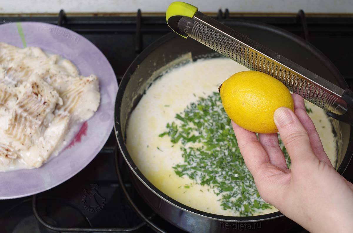 Именно нежный сметанный соус является изюминкой этого простейшего рыбного блюда. Основой соуса служат сметана и молоко, достаточно нейтральные на вкус, которые приправляются чесноком, ароматной зеленью, а также соком и цедрой лимона. В итоге соус имеет приятный, немного пряный вкус с яркой и освежающей цитрусовой ноткой, который не заглушает нежного вкуса рыбного филе, но очень грамотно его дополняет, создавая вкусное и хорошо сбалансированное блюдо для правильного питания.
