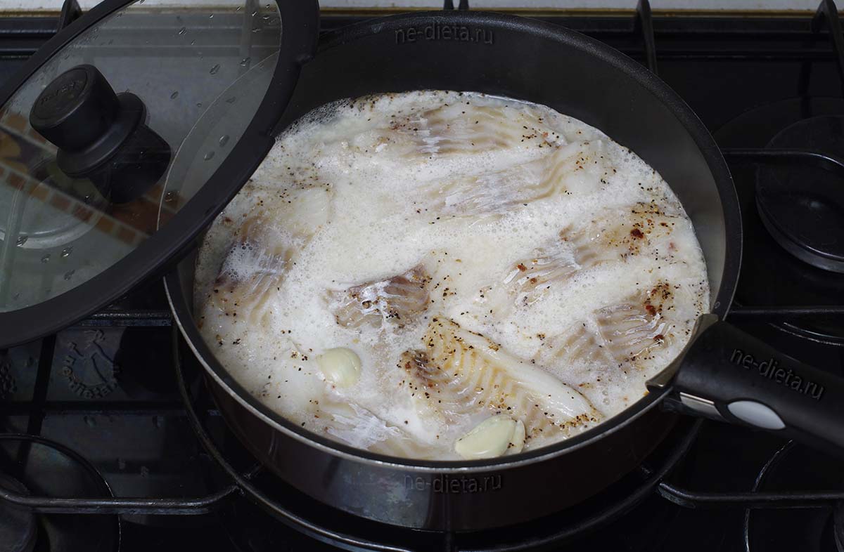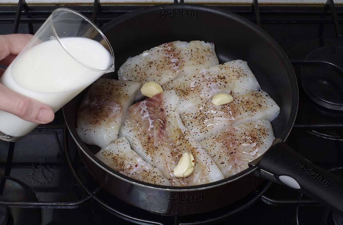 Рыбное филе выложить в глубокий сотейник, посолить и посыпать молотым перцем. Дольки чеснока раздавить плоской стороной ножа и в таком виде добавить к рыбе. Содержимое сотейника залить молоком, накрыть крышкой и поставить на средний огонь.