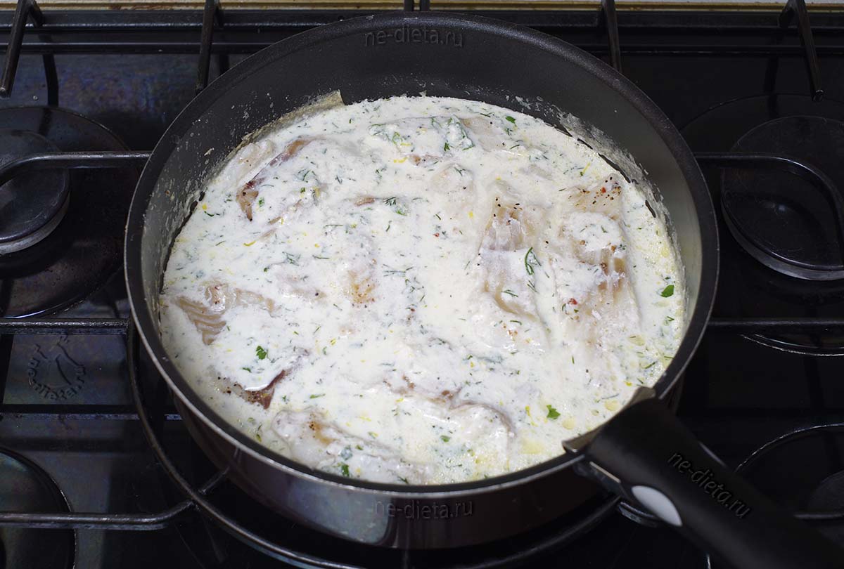 Вернуть в сотейник кусочки рыбы и аккуратно покрыть их сметанным соусом.
